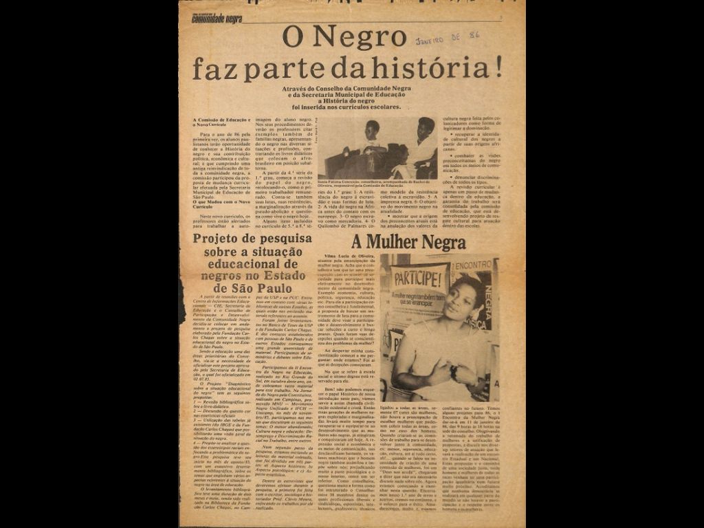 Recorte de jornal com anotação da data janeiro de 1986, composto pelas matérias: O negro faz parte da história, Projeto de pesquisa sobre a situação educacional de negros no Estado de São Paulo, A Mulher Negra, A recuperação de Cafundó e o trabalho do professor Carlos Vogt.