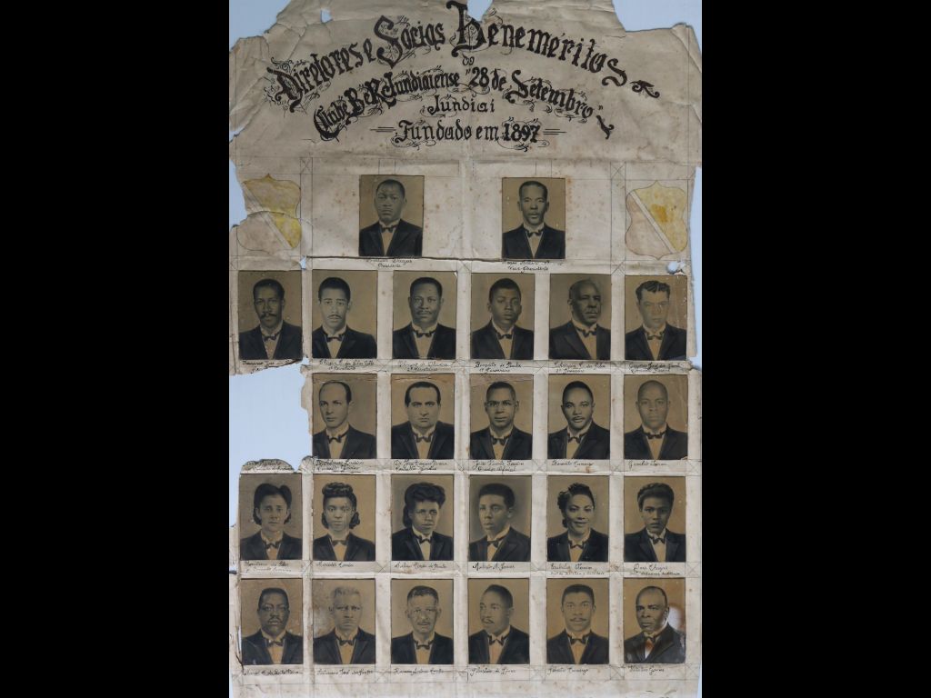 Quadro com fotografias de diretores e sócios beneméritos do Clube 28 de Setembro acompanhado do nome e cargo ocupado por eles. No quadro há imagens do Presidente: Aristides Chagas; Vice Presidente: Roque Albino Franco; Secretário: Francisco José dos Santos; Primeiro Secretário: Chispin C. da Silva Filho; Secundo Secretário: Olímpio de Oliveira; Primeiro Tesoureiro: Benedito de Paulo; Segundo Tesoureiro: Chrispin C. da Silva; Comissão Fiscal: Gregório José dos Santos; P. Comissão de Sindicância: [...] Agostinho; Consultor Jurídico: Dr. Adoniro Ladeira; Consultor Jurídico: Dr. José Romeiro Pereira; Orador Oficial: João Vicente Ferreira; Benedito Camargo; Geraldo Irineu; P. Comissão Feminina: Presciliana da Silva; Mercedes Corrêa; Avelina Corrêa de Paula; Arlindo A. Soares; Diretora da Biblioteca e Publicidade: Eulalia Ferreira; Diretora de Ensino e Assistência: Doris Chagas; Manoel C. da Rocha Vieira; Saturnina José dos Santos; Haracis Antônio Corrêa; Sebastião de Lima; Silvestre Camargo e Vitalino Gomes.